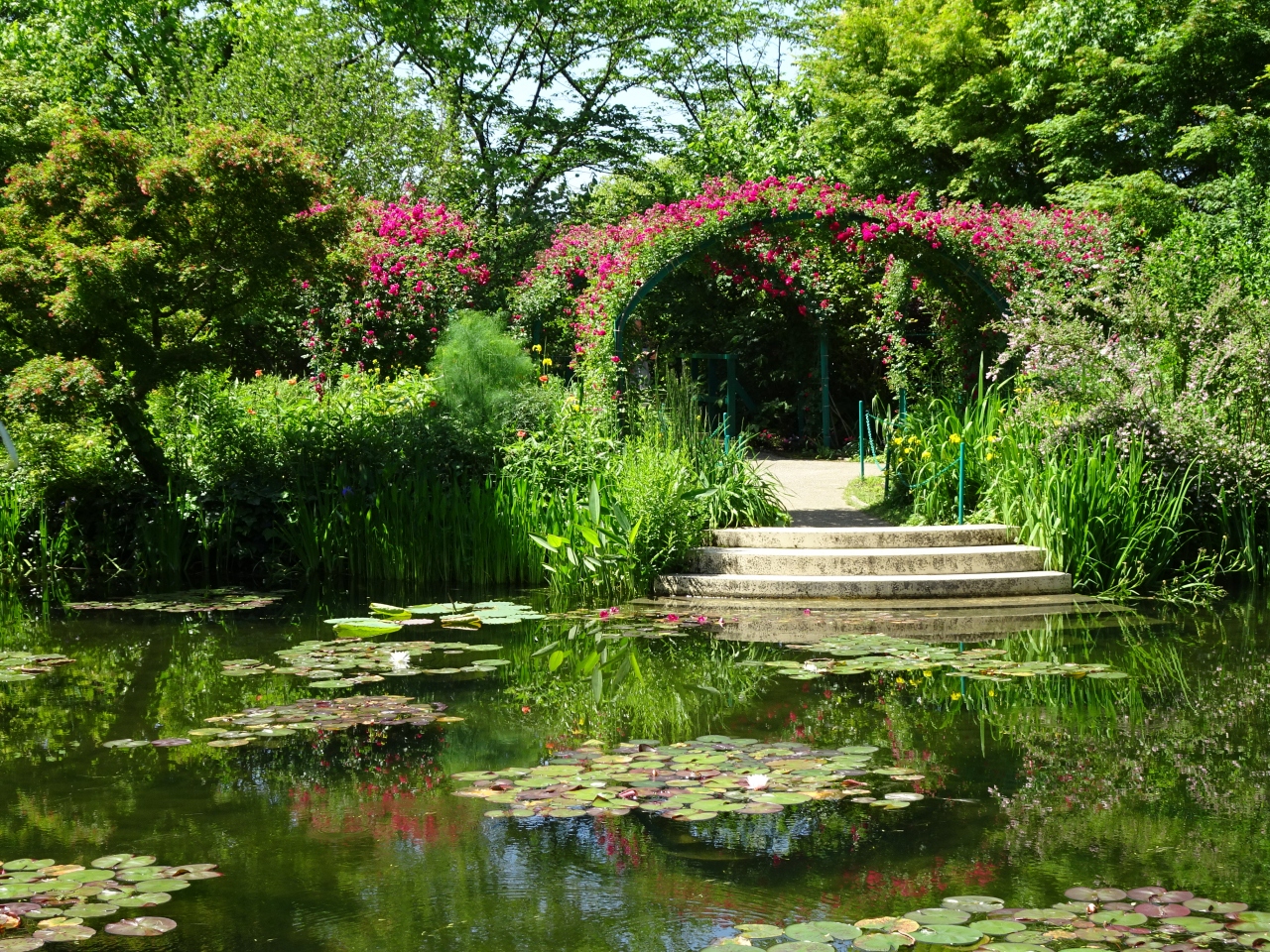 翌年5月12日バラのアーチを見に再訪です。バラのアーチは見頃で、柔らかい色の春の花は終わりかけでした。睡蓮の数は夏より控えめで開花は11時~14時です。次はチューリップの時期に行きたいです。