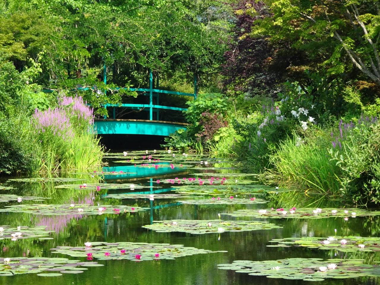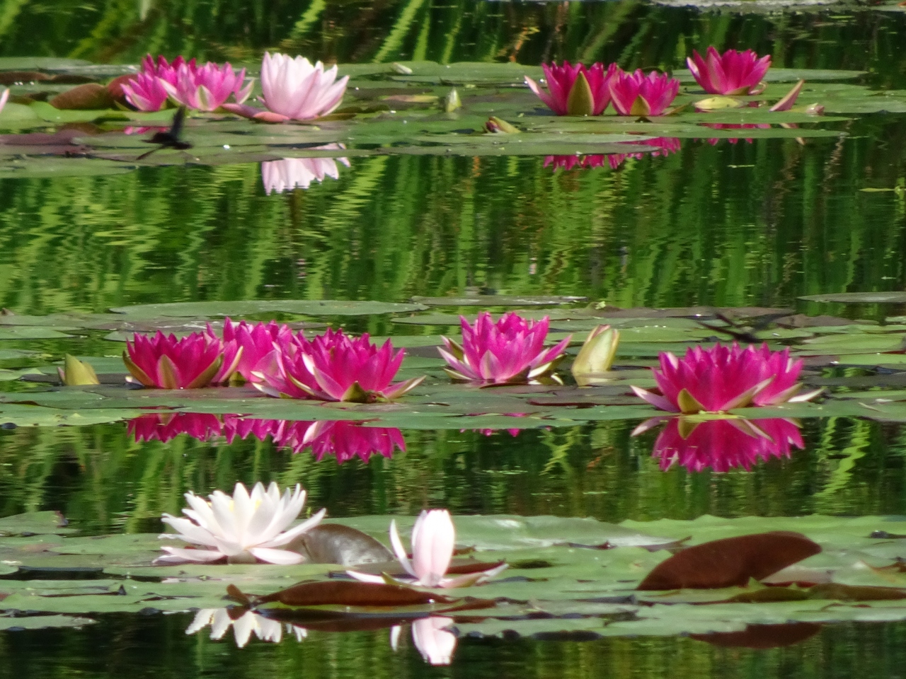 モネの睡蓮を見たくてやっと念願が叶いました。7月3連休この時期はモネが夢見た青い睡蓮が咲くのですが完全に開花したのは10時でした。青い睡蓮は数が少ないですがこの日は全体で150輪の睡蓮が咲いていたそうです。また金属光沢をもつ青く美しいチョウトンボも飛んでいました。花の庭ゾーンは暑さのためか、残念な事に花が萎れていてあまり咲いていませんでした。
