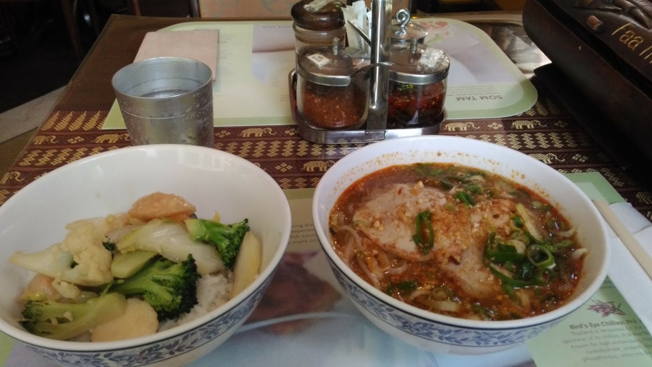 今日は、トムヤムビーフンと野菜と団子の丼ぶりセット。注文するとおなじみナンプラー、辛子、砂糖などの調味料セットがまず出て、続いて料理登場。この調味料セットがタイ料理必須なのに、ランチでは出てこない店もあるので、基本に忠実でいいですね。ご飯は、タイジャスミン毎。やはりこれでないと。値段に応じて満足度のあるランチでした。