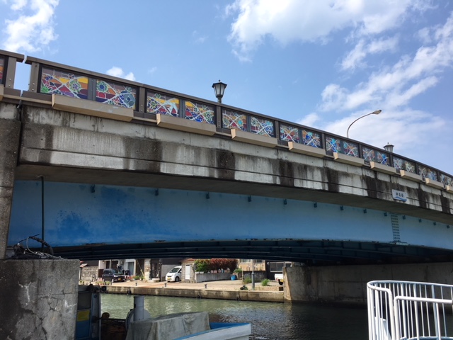 内川散策の拠点ともいえる「川の駅 新湊」から散策を始めると、河口に向かって最初にある橋です。昭和60年に完成し、高欄には、地元新湊出身の工芸作家大伴二三弥氏作の、新湊市の木である松や市の花ケイトウ、曳山、カモメなどが描かれた72枚のステンドグラスがはめこまれています。