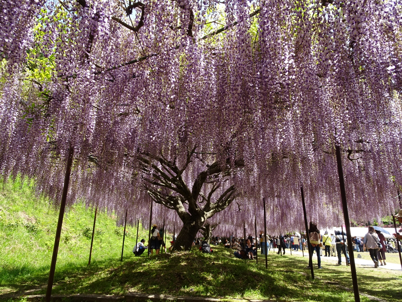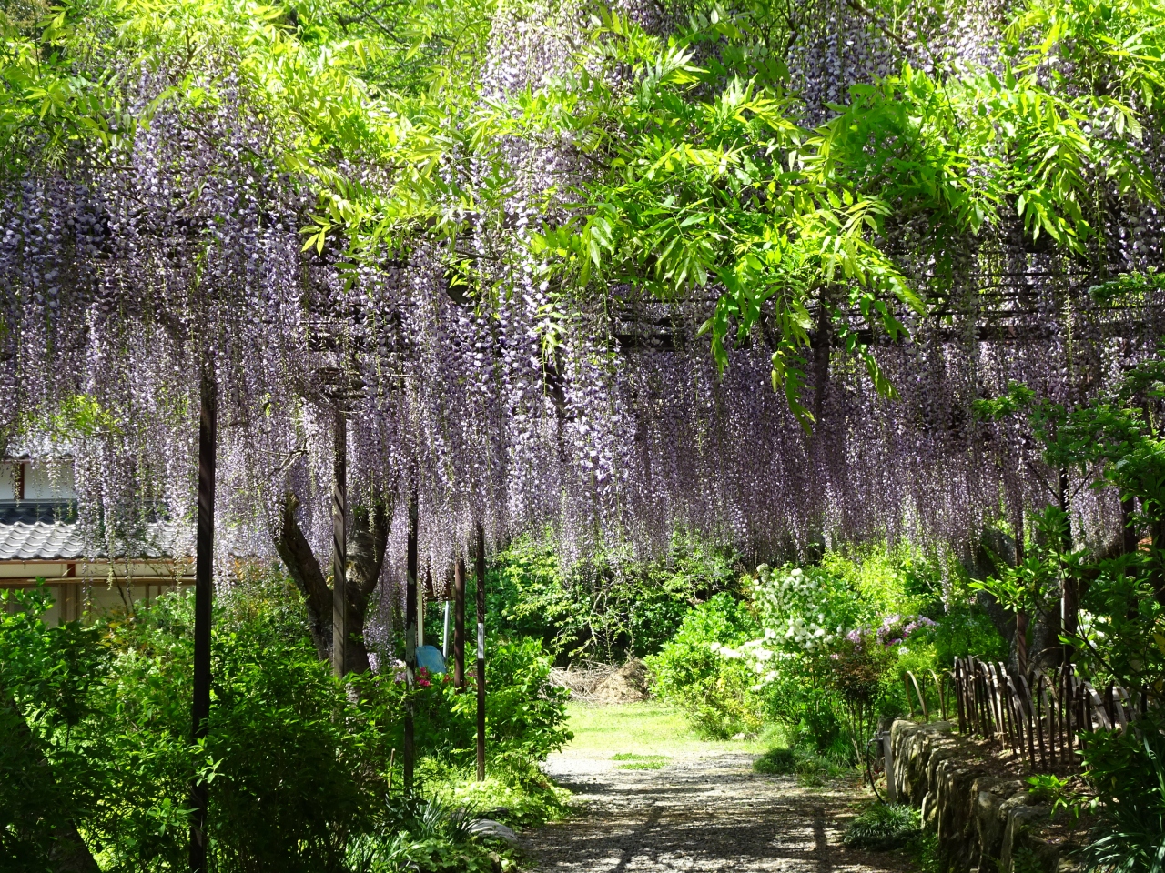 百毫寺に着くとL字型に並んだ藤の花は満開で甘い匂いです。外側は少し枯れていましたが木の下に潜ると綺麗に咲いています。よく紹介されている写真はライトアップした藤を下から捉えた構図なので大きな木を想像していた私は期待はずれでがっかりしました。隣の近藤フジ園の藤の方が、木1本が横に長くてこちらの方が見事だと思いました。折角遠くまで来たのでライトアップも見たかったのですが暇つぶしが出来る場所が何もないので諦めました。