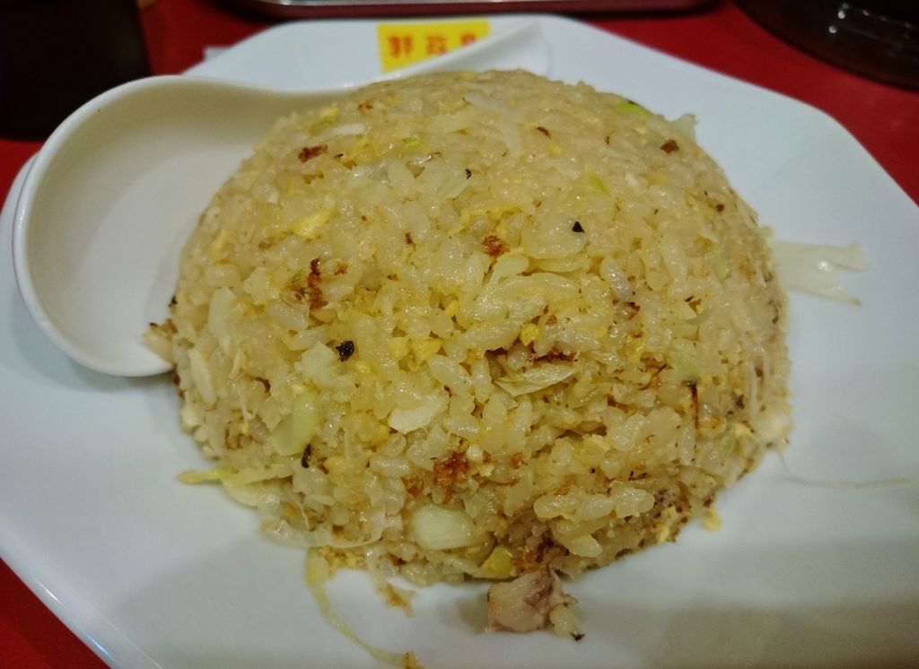 炒めたてで提供。香ばしさあります。ちょいパラくらい。しっとりさのほうがやや勝っているか。 塩胡椒に刻みニンニク。全体にしっかりとニンニク。 火が通っているため尖りはなく、甘みを伴う優しめの風味です。 細切れ肉は塩気が入っていていい。白/青ネギはシャキッといいアクセントです。チャーハン単品としては量が少ないです。