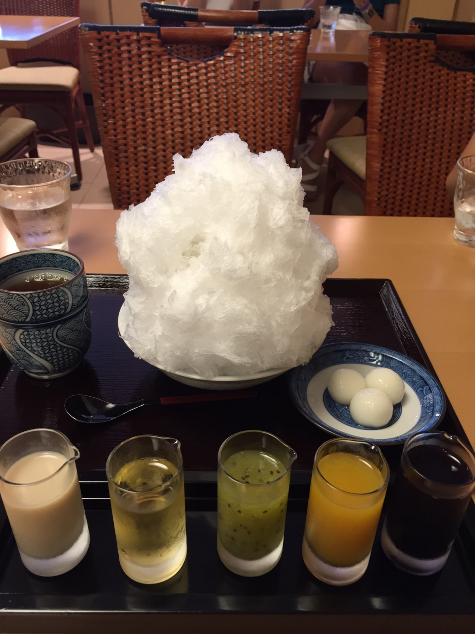 ずっと話題の「彩雲」が食べてみたかったので、テンションを上げながら娘二人席についたのですが、定員さんに「お1人1品の注文をお願いします。」と言われ、えーっ!かなり大きいかき氷をシェアしちゃいけないんですかー!?上の娘はともかく、下の娘8歳なんですが(涙)と思いましたが、言われるままにかき氷2つと和菓子セットをチョイス。ちょっと贅沢なおやつになっちゃいましたが、彩雲は、やはり一食の価値ありです!旬のフルーツや和菓子屋さんならではの和のソースは秀逸でした。見た目も素敵で、もちろん美味しかったです。