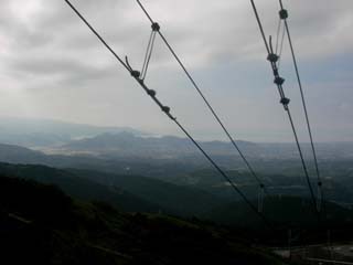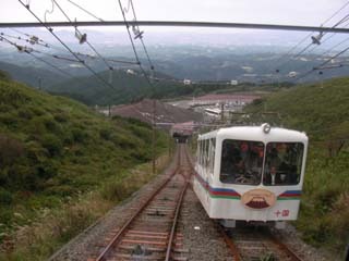 十国峠ケーブルカーの登山口駅から階段を上ると、以前駒ヶ岳ロープウェイにもあった記念撮影があり、少し古びたケーブルカーに乗るとハロウィンの飾りがあり、すぐに出発します。中間地点で下りのケーブルカーと交換して、沼津アルプスが見えて5分ほどで山頂駅に着きました。