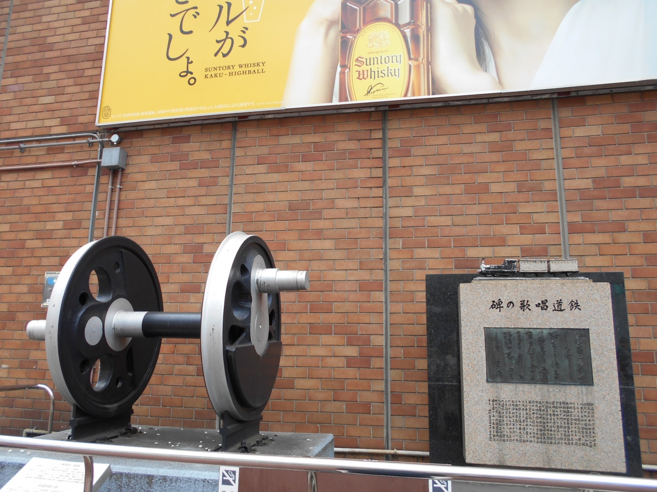 駅前にある「動輪」と並んで右側に建っている「鉄道唱歌の碑」を見学。