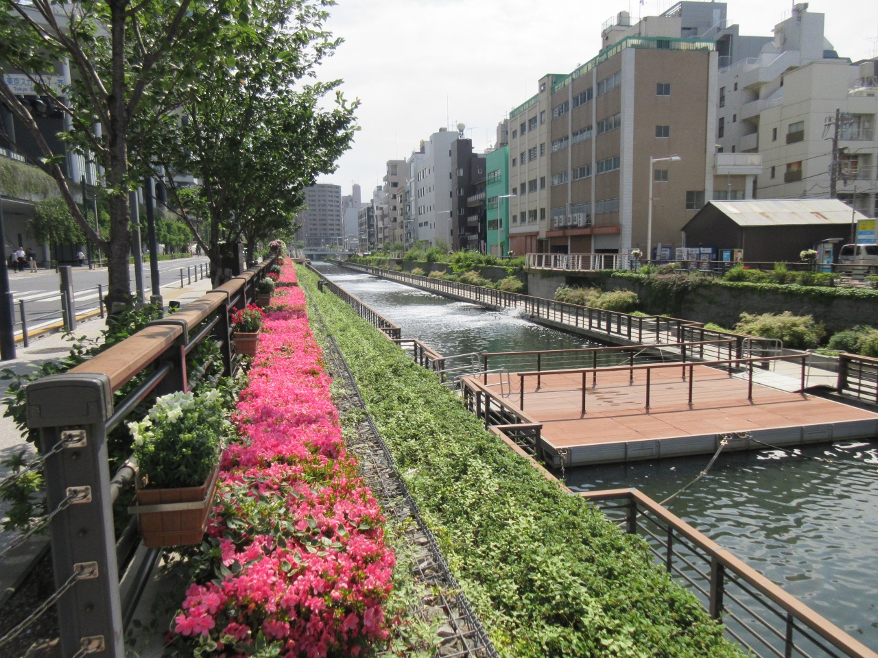 東京スカイツリーの西側、ツリーの真下に造られた北十間川沿いの緑地帯です。川に沿って植えられたピンクのツツジがきれいでした。公園沿いの歩道には川を眺めるためのエリアも造られています。川では下町探検ができるお座敷船も運航されています。巨大な鉄柱の塊であるツリー周辺はビルが建ち並んでいるため、少しでも緑豊かな心和むエリアを築こうとして造られた緑地帯だと思います。