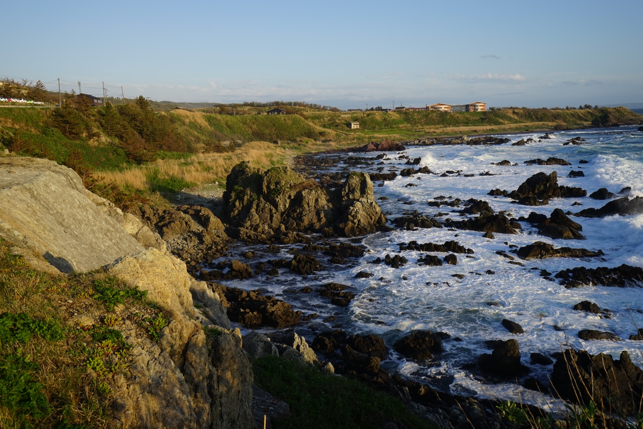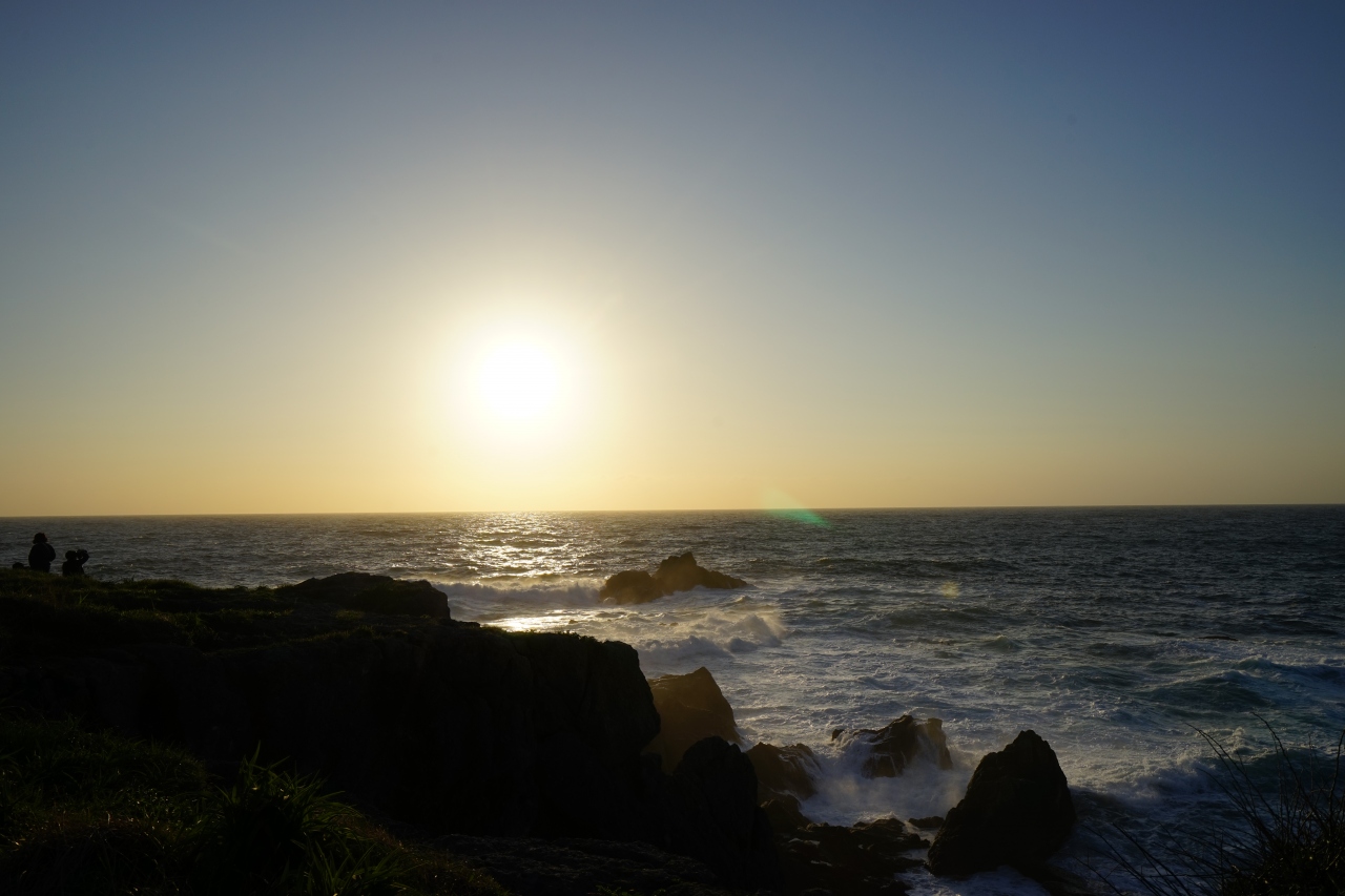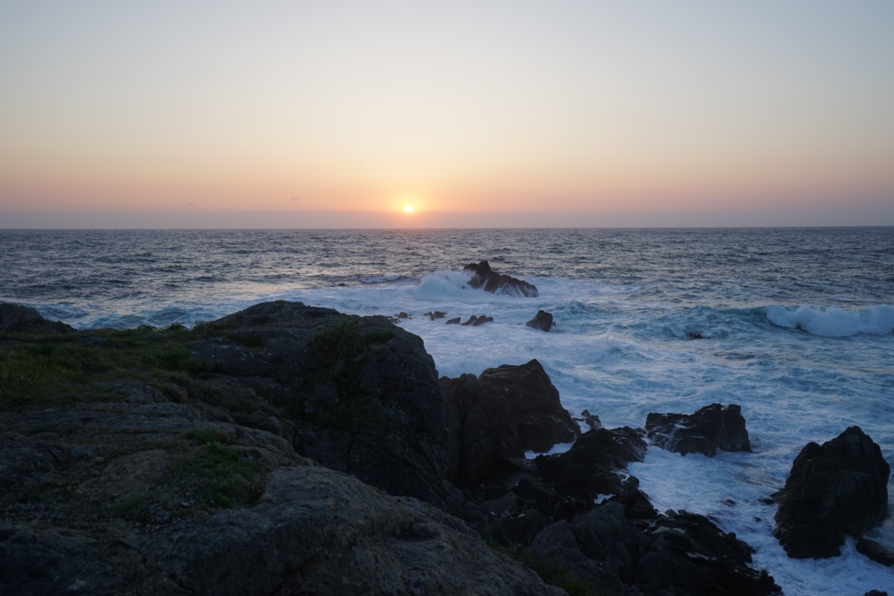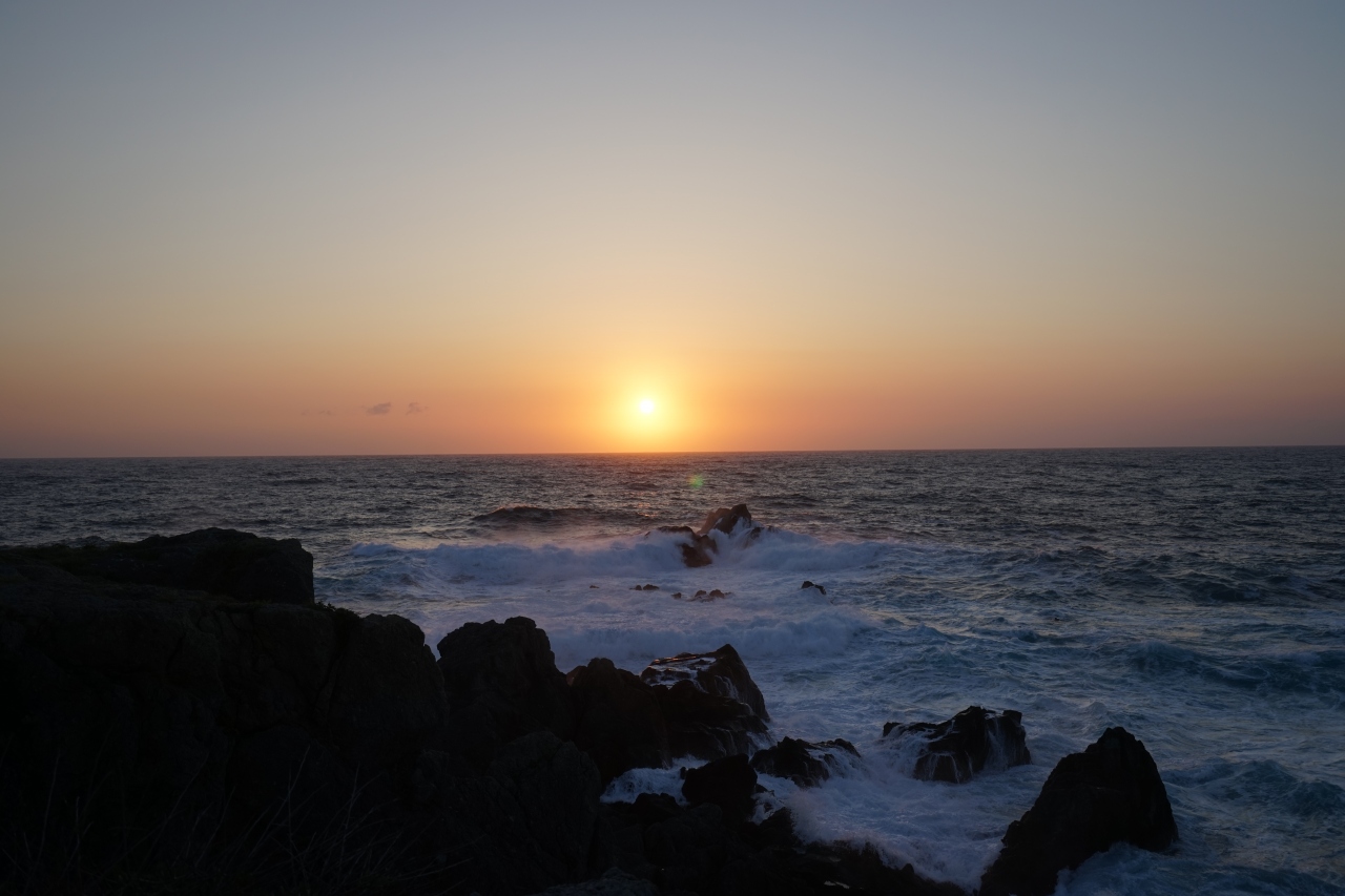 七浦海岸から突き出した春日崎。近くに駐車場もあり、車をとめ散策。激しく波が打ち寄せ迫力があります。先端の正面に夕日が 沈んでいく正に絶景のスポットでした。夕日が沈んでいくまで30分ほどここで過ごしました。江戸時代の灯明台が雰囲気ありました。