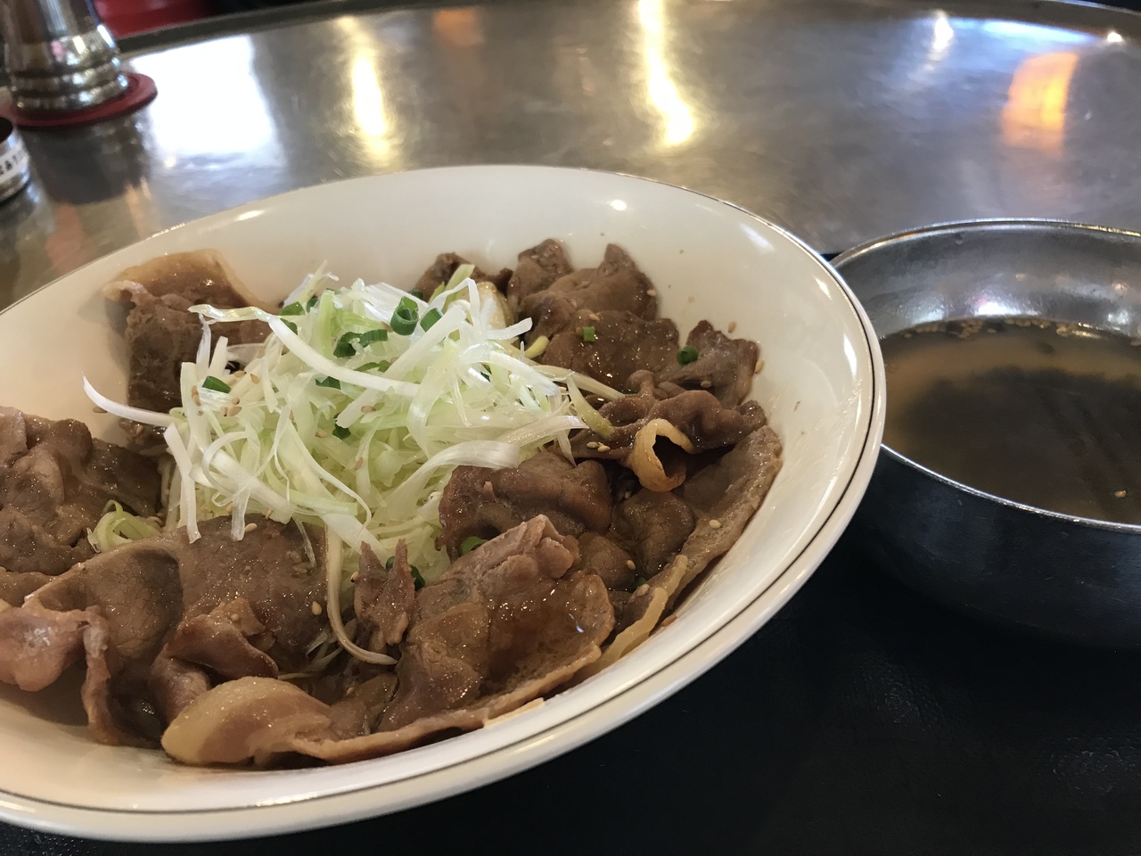 新宿サザンテラスにある韓豚屋。休日もランチメニュー有りです。豚ロース丼です。ワカメスープにサラダバーが付きます。プラス100円払えばドリンクバーもつけられます。サラダバーはレタスにもやしナムルにワカメとコーンにインゲンです。