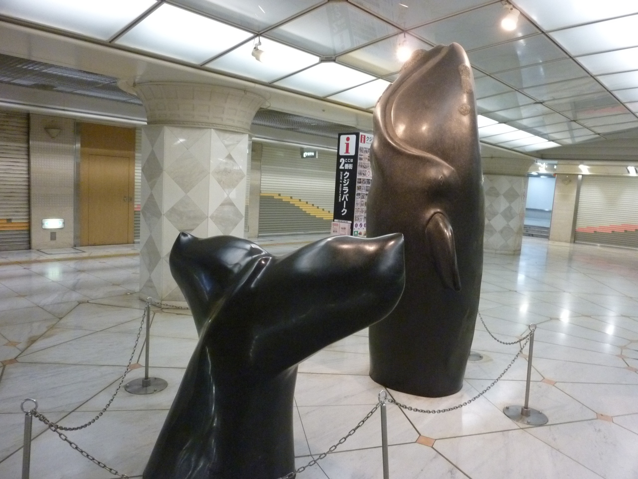 ショッピングや飲食店が多く集まる地下街の便利な場所、どのお店も似たように見えてきて、グループで利用していると地下街なので方向を見失いがちです。でも、自由に歩いていてもちゃんと集まる場所が見つかりました。こんなくじらのモニュメントがあれば、道に迷っても大丈夫です。