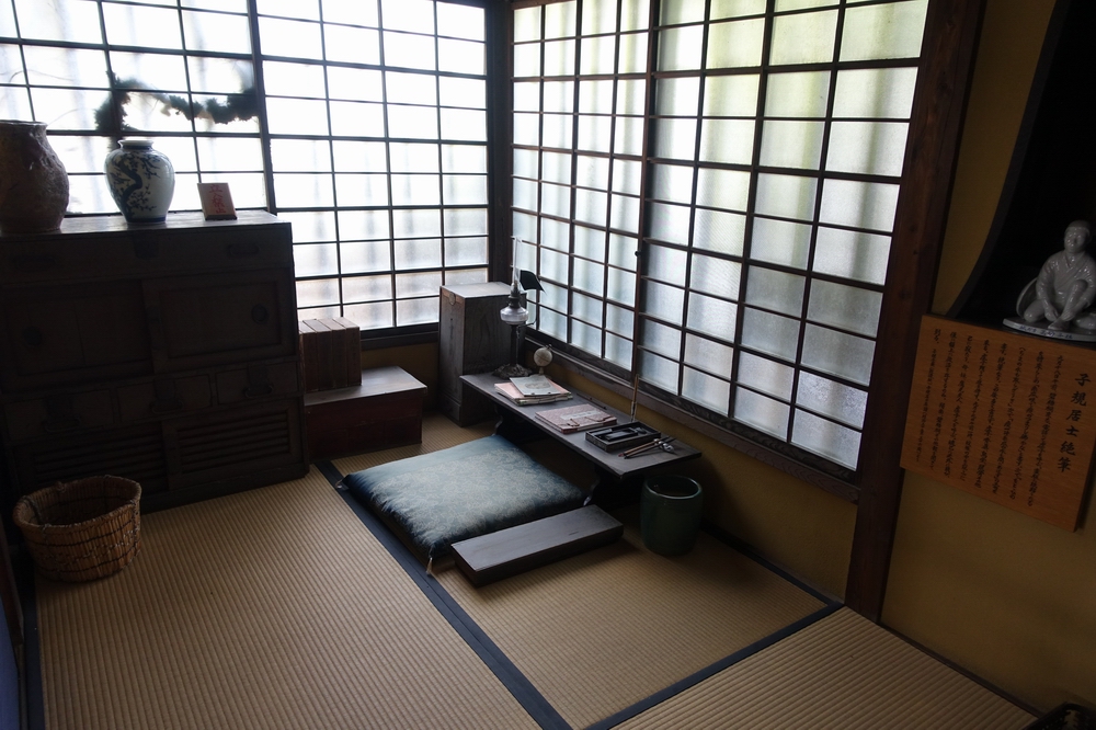 子規堂内へは土足のまま入るようになっていました。子規が17歳まで過ごした住居を復元したもので、机や原稿など遺品を展示しています。復元なので昔のままの建物ではないのでしょうけど、勉強部屋など当時の様子が伝わってきました。エアコンが無いので夏はちょっと暑いですね。