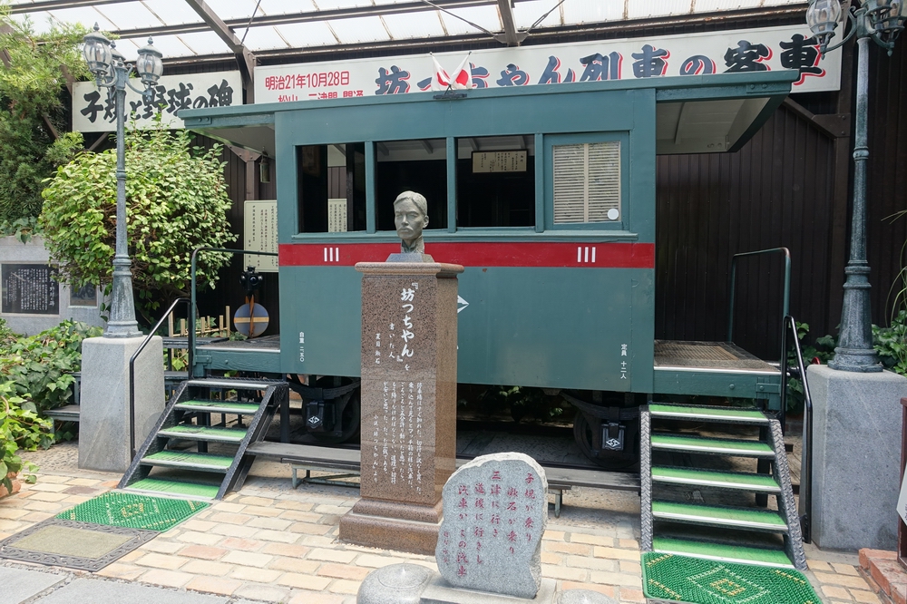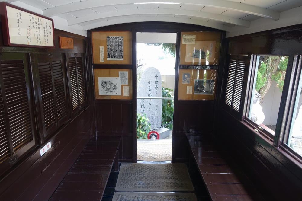 ここのもう一つの見所は子規堂の向かいにある坊っちゃん列車の客車です。実物の客車が1両保存されていて中にも入れます。窓に付いてる日除けの鎧戸がいい雰囲気を出していました。あと、本堂の前に横綱千代の富士の顕彰碑があったのですが、ちょうど前日61歳で逝去されたというニュースがあったばかりで… なんかすごいタイミングでした。