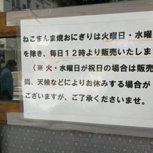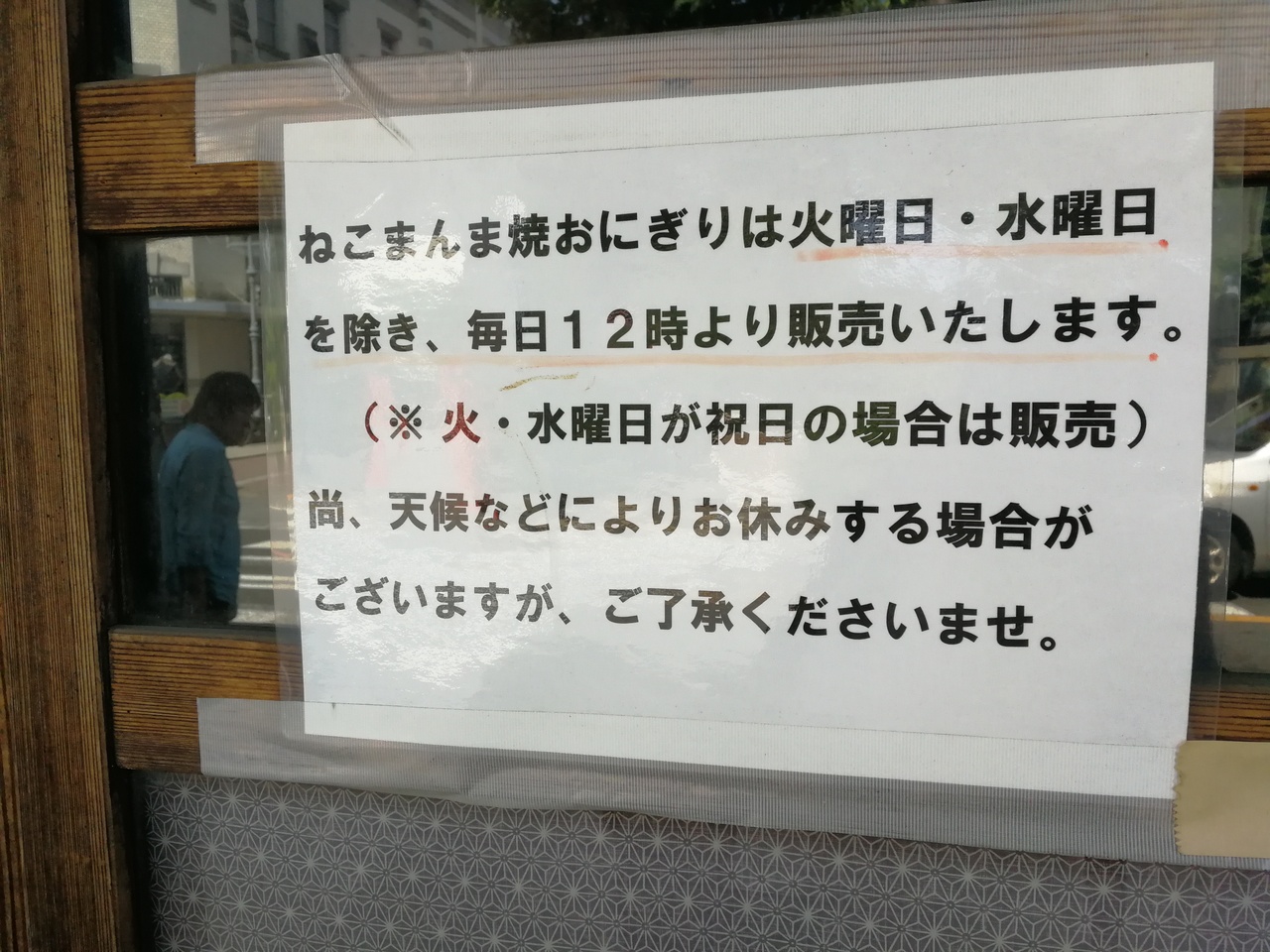 店頭で焼いているという、ねこまんま焼きおにぎりを目当てに訪れしましたが、火、水曜日は焼いていないとのこと。