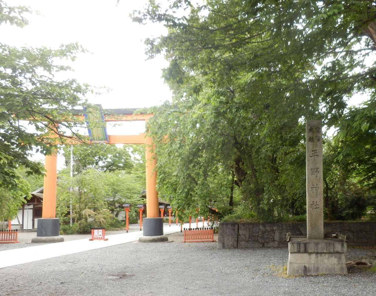 都が平安京に遷都された時大和から遷座した四座を祀っている、旧社格は官幣大社、北野天満宮参拝後天満宮北門を出て左へ向かい紙屋川を渡ると平野神社正門前に出ました、朱色の大鳥居の上段の扁額には”平野皇大神”と記されていた、御本殿は当初から皇室との関連の深い古社で当時の威厳を保っていた平日お昼であったので参拝者かごくわずかで御本殿は静寂の中に鎮座されてました、南門方向へ向かうとそこは桜の庭園が広がっていました桜の時期ではないので葉桜の見物になりましたが満開の時はさぞきれいなことと思います
