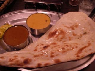 店内はアルコールが入って賑やかなグループがいて、タマネギのアチャールと、甘口と辛口の3種類のチャツネが先に出されて、ペアカレーがやってきました。ナンは平たい感じで、チキンカレーはそれなりに辛く骨付きのチキンが入っていて、甘口のバターチキンと交互にいただきました。