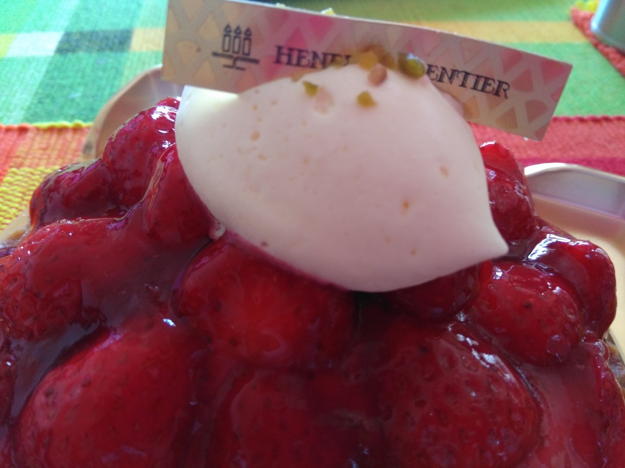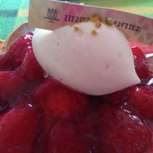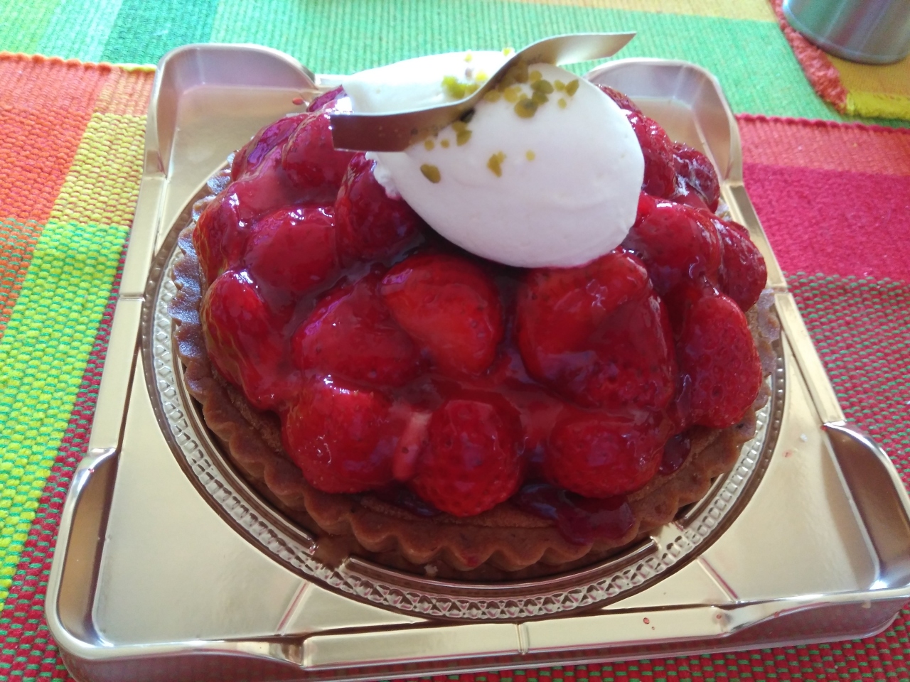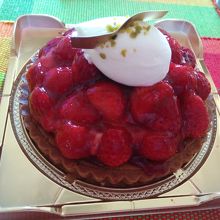 美味しそうなスイーツが沢山並んでします。今日はイチゴのタルトを購入しました。ビスケット生地はしっとりサックリバター風味カスタードクリームはしっかりしていて崩れません。半分に切ったイチゴがドーム型天井にぎっしり。イチゴの酸っぱさと生地やくりームの甘さが絶妙な美味しさです。
