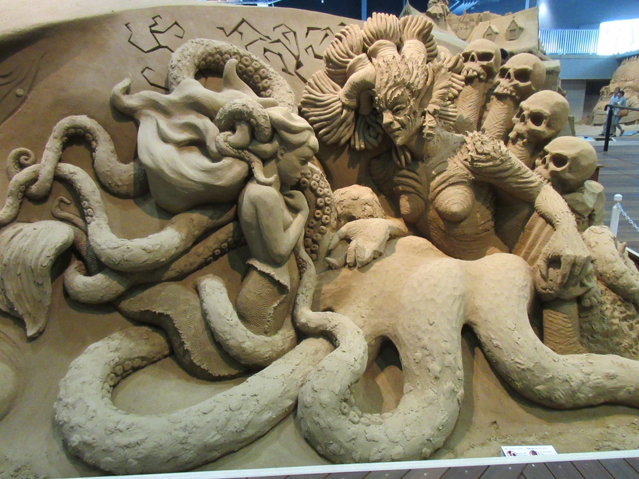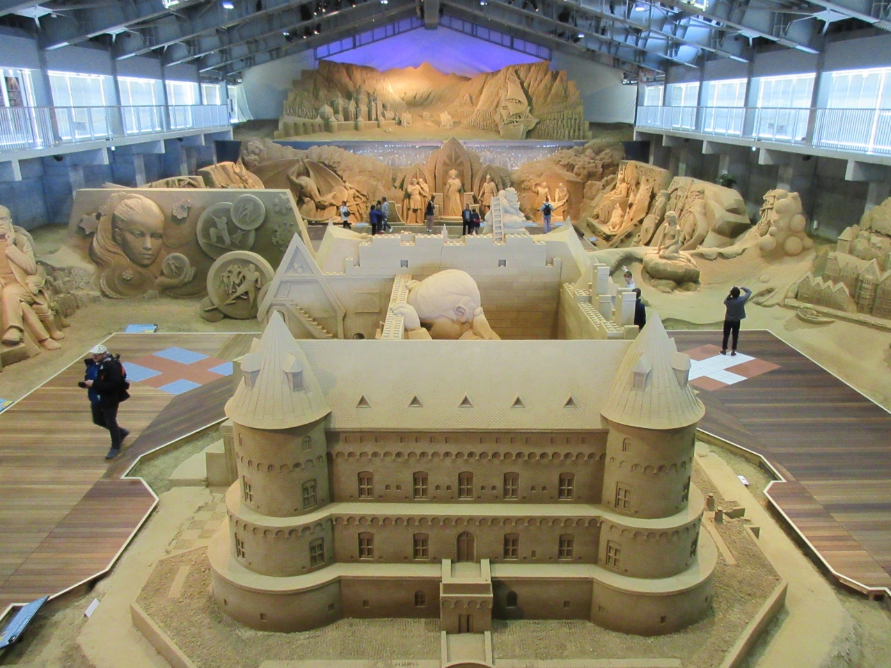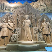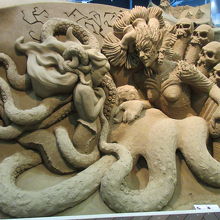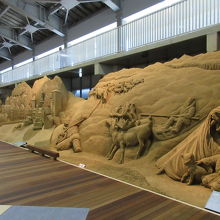 鳥取砂丘で行きたかった砂の美術館へ行きました。製作中の映像を見てから砂像展示室に入りました。独特の臭いと壮大な作品に圧倒されました。中に入って見るうちに臭いは気にならなくなり、作品をじっくり見て回りました。今年のテーマ北欧編の作品はどれも雄大かつ緻密で驚きました。特に気に入ったのが人魚姫とトロルと北欧の森でした。ゆっくり見てから3階の廻廊から眺めると、作品の細部を上から見ることができ、正面から見て感じた遠近感をどのようにして造り出しているのかが素人にもわかりました。屋外にも砂像がありましたが、室内と比べると乾いていました。毎年テーマが変わるので、何回来ても面白いと思います。鳥取砂丘に来たら寄ることをおすすめします。