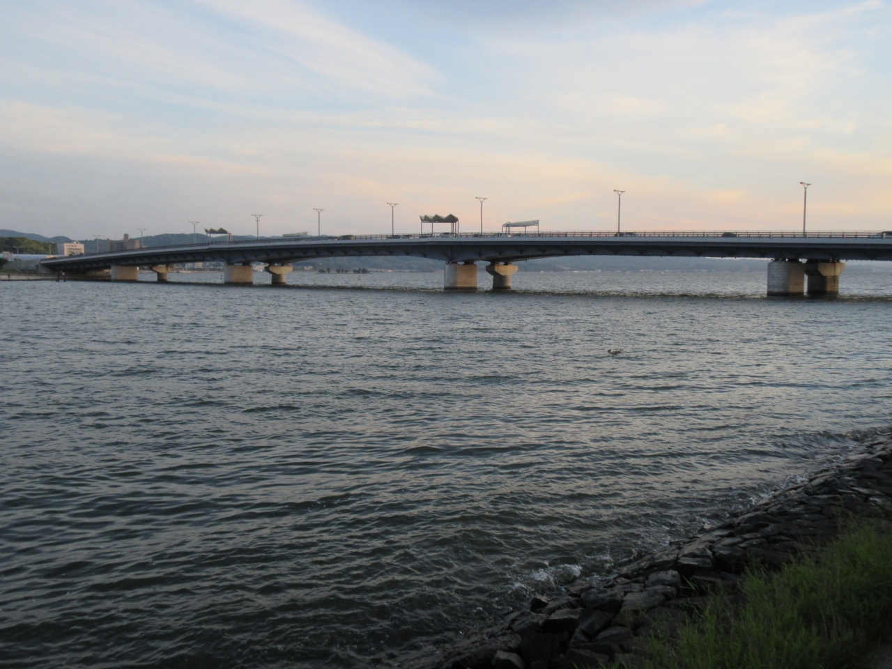 宍道湖から大橋川が始まる所に架かっている交通量の多い橋です。松江レイクラインで通りました。橋の中ほどに歩行者が宍道湖や大橋川を眺めることができる展望スペースがあります。歩く人は少なかったです。後日夜に宍道湖大橋を眺める機会がありました。欄干と街灯の灯りがポツポツと点のように暗闇に浮かんでいて静かな雰囲気でした。