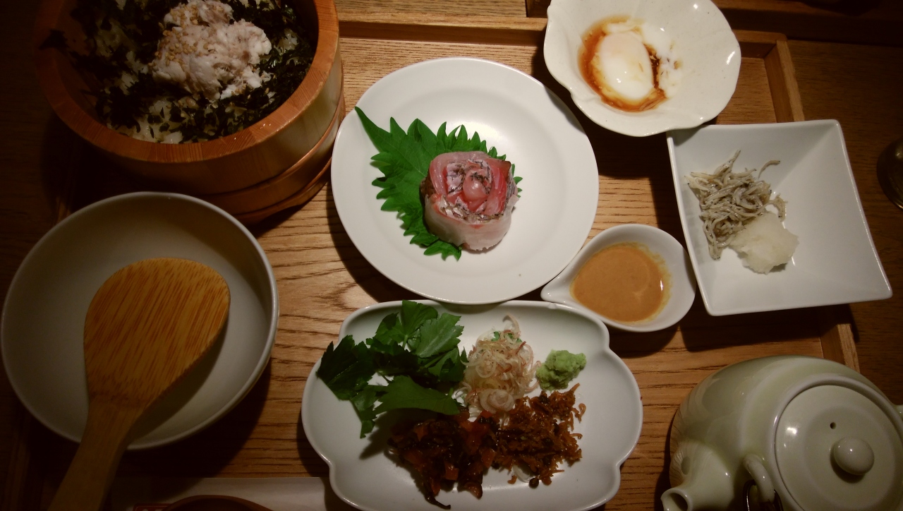 ランチで利用しました。日曜のせいか混んでいました。またランチですが、10名以上で宴会されているグループとかあったりして、大人数の利用も可能です。でもそのために余計こむのかもしれません。靴をぬいで掘りごたつのような席があり、夜飲むことを想定しているつくりだなとおもいました。鯛茶漬けのランチセット1480円をオーダー。だし茶漬けえんなども経営されているだけあって、お茶漬けのだしはしっかりした味でした。鯛茶漬けって鯛の刺身のみの店が多いですが、身を焼いたものをほぐしたものがのっていました。おひつにご飯がはいってきます。さらさらとおいしくいただけました。