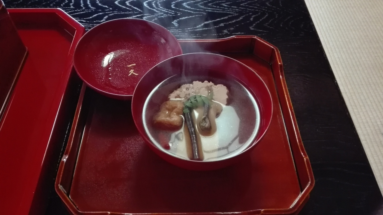 精進料理は春慶のお重に盛られていた。豆腐・ごぼう・湯葉・金柑・菜の花辛し和え・豆ご飯・香の物という献立で、とても美味しかった。以前に鎌倉で食べたまずい精進料理を思い出し、精進料理もいろいろあるものだと再認識。食後は柿のお菓子に大徳寺納豆を食べ、お抹茶をいただいて、大満足で店を後にした。