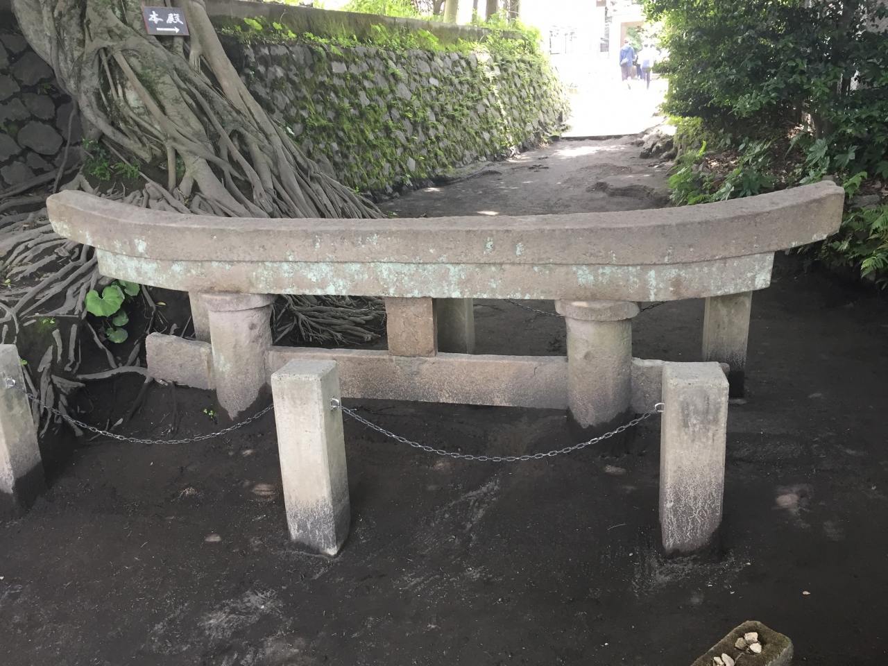 大正3年の噴火で2m埋没した鳥居は現在、上部の約1mのみが見えます。当時の噴火のすごさが想像出来ます。鳥居の奥には本殿がありますが、途中左側に黒神中学校があり、生徒会活動として鳥居近辺の掃除等を行っているとの看板がありました。
