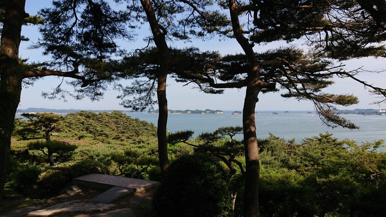 日本三景と言いますが、松島では海岸線を歩いても絶景を拝めません。ある程度、高いところへ行けば、島が浮かび、奥行きのある風景に出会えます。ここはそのうちの一か所。足元の木が短く切られていて眺めがいいです。ただ、ここを訪れる人は少ないようで、道の途中で外国人旅行者一人とすれ違っただけでした。