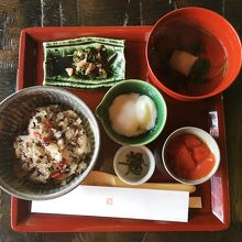 たまたま訪れた日がお祭りの日で、2階席からはお祭りがよく見えました。和菓子のお店だけあって、食前食後に和菓子が出るのも嬉しいです。お祭りの日だったので、ごはんには赤こんにゃくが入った特別バージョンでした。