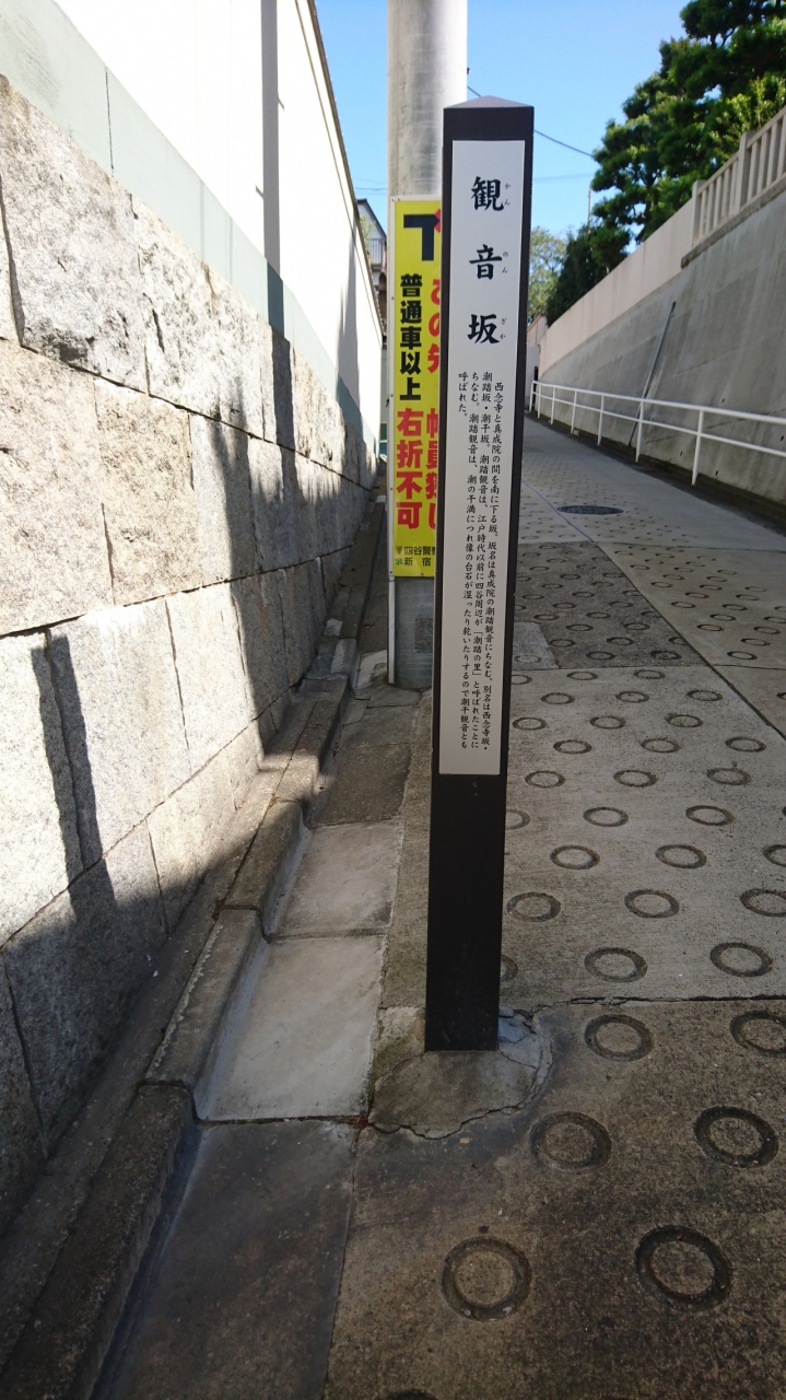 四谷にある西念寺と真成院の間を南に下る坂で、真成院にある潮踏観音に因んで観音坂と呼ばれています。西念寺坂、潮踏坂、潮干坂とも呼ばれているそうです。とても急な坂道ですので、寺院にお参りするのも大変でした。