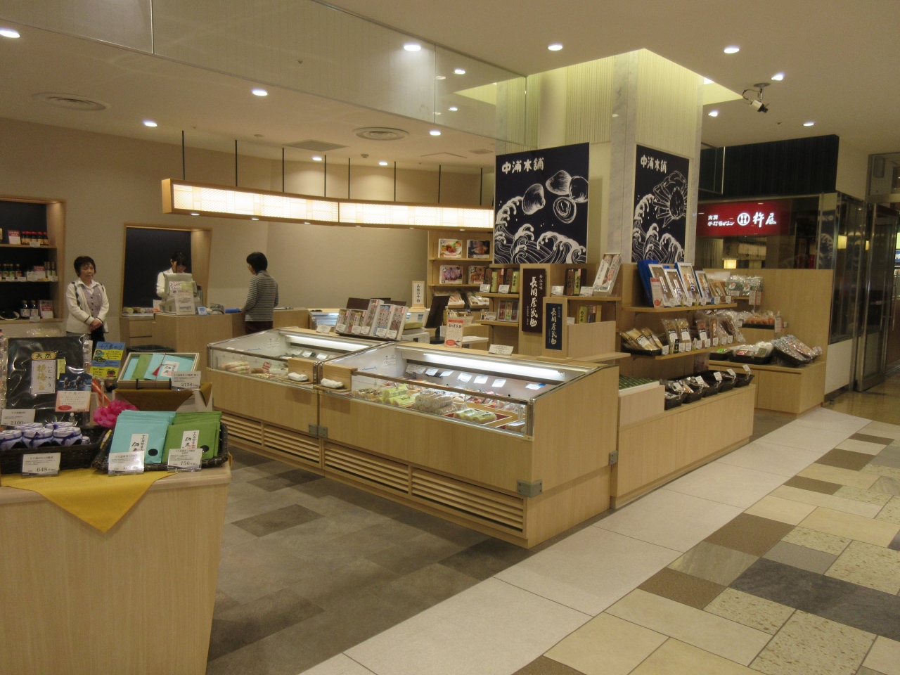 松江に3泊した時に土産をまとめて買いました。松江駅改札口の前にコンビニや駅弁などの店舗が並び、さらに奥に松江名物の和菓子や洋菓子などから日持ちする食品各種を扱う食の専門館があります。食の専門館に入っている店の中には一部商品の試食ができました。JRで松江駅に戻り、ホテルへ帰る前にゆっくり土産を選びました。食の専門館は明るく広々していて、どの店もそばを歩く人に積極的に声掛けをしないので自分のペースで商品を見て歩けました。扱う商品の種類が多い店でまとめて買って送ることに決めて、スタッフに相談すると一緒に選んでくれたり、お得な買い方を教えてくれたり親切でした。客にグイグイ押してこない接客態度は好感持てました。ごちそう広場にはベーカリーから居酒屋まで入っていて手軽に利用できます。土産物をまとめて送るのに便利です。