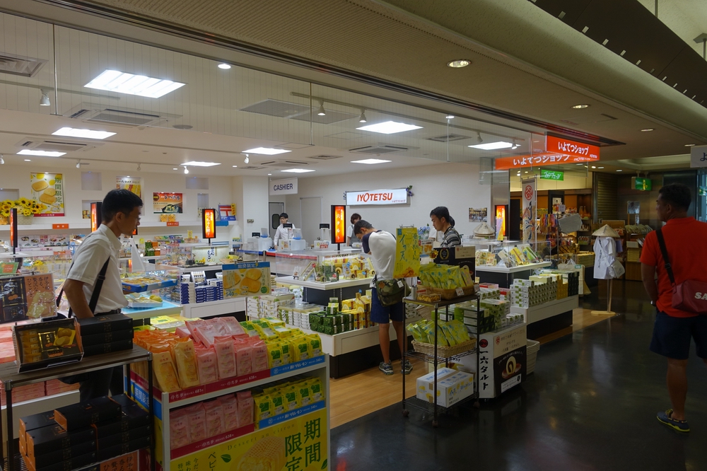 2階出発ロビーの土産物店の中で、一番大きな売り場面積なのがいよてつショップです。JAL系のSKY BLUEやANA系のANA FESTAよりも明らかに広く、地元の有力企業であることがうかがえます。