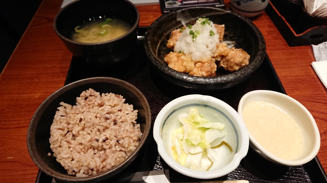 このメニューはおろしポン酢や油淋鶏など味付けを選べて、ごはんも白米か玄米か選ぶことができました。