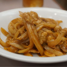 まず紹介したい必食の料理は、水口オリジナルの味付けの「いり豚」。具材は細切れの豚肉と玉ねぎだけなのですが、味付けが唯一無二。カレー味に炒めているらしいですが、これはスパイスを使っているということでしょう。ソースはナポリタンというか、あんかけスパというか酸味のある独特なもの。これがお酒のつまみにも、定食ならご飯にもばっちり合います。
