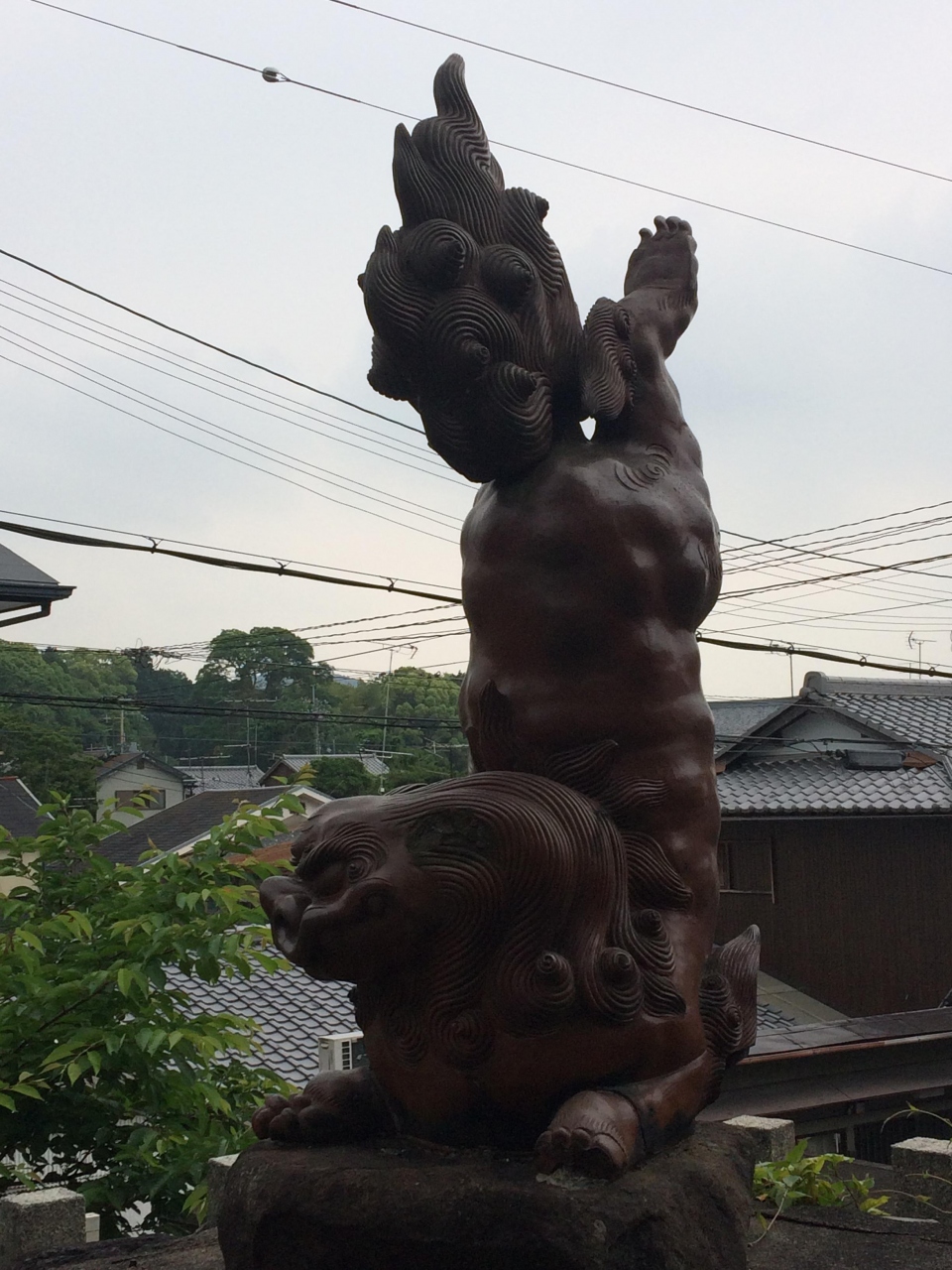 鳥居横に立つ備前焼の逆立ちの狛犬がユニークです。