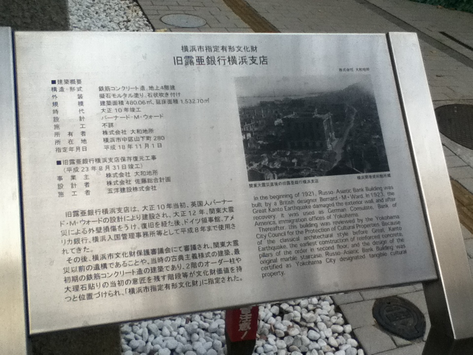 日本大通り駅南東の広い道路沿いにある。建物の入口上にはラ・バンク・ド・ロアと記載されている。他にこの建物を見ている人はいなかった。お勧めの点は、建物は1921年に露亜銀行横浜支店として建設されたものであること、関東大震災や横浜大空襲も耐え抜いてきたこと、建物は石造で重厚な雰囲気があること、今は結婚式場として利用されていること、横浜で唯一現存する外国資本の銀行建築の遺構であり見る価値が高いことである。