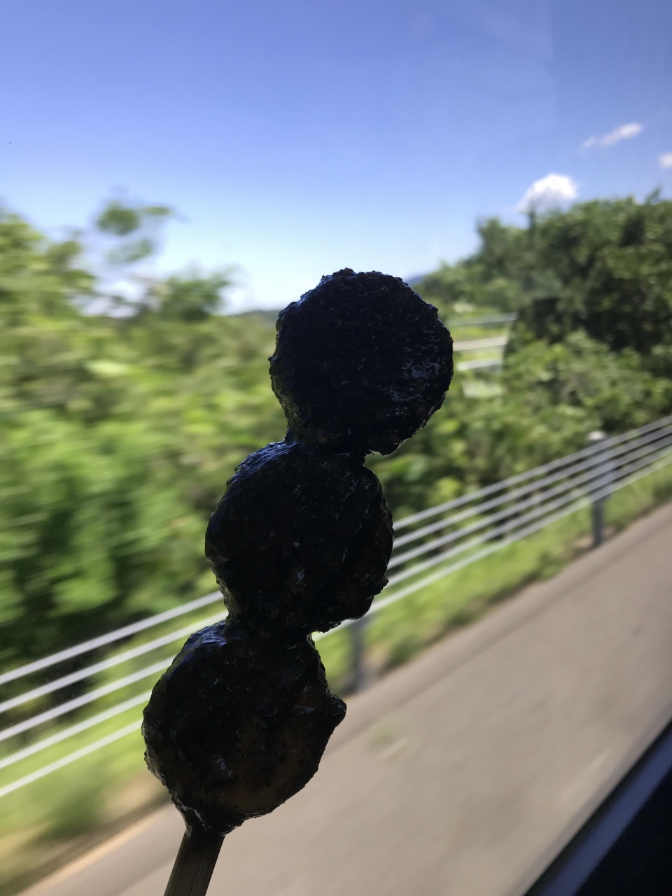 はじめは車内で食べるものを買っていたのでスルーしたのですが、あまりにおいしそうなものばかり並んでいたので、いったん外でたものの食べずに死ねないと思い直し、また戻って購入したくらいです。ぽたぽた餅というのはご当地おやつみたいで見た目はゴマでまっくろですが甘しょっぱくてくせになる味でした。