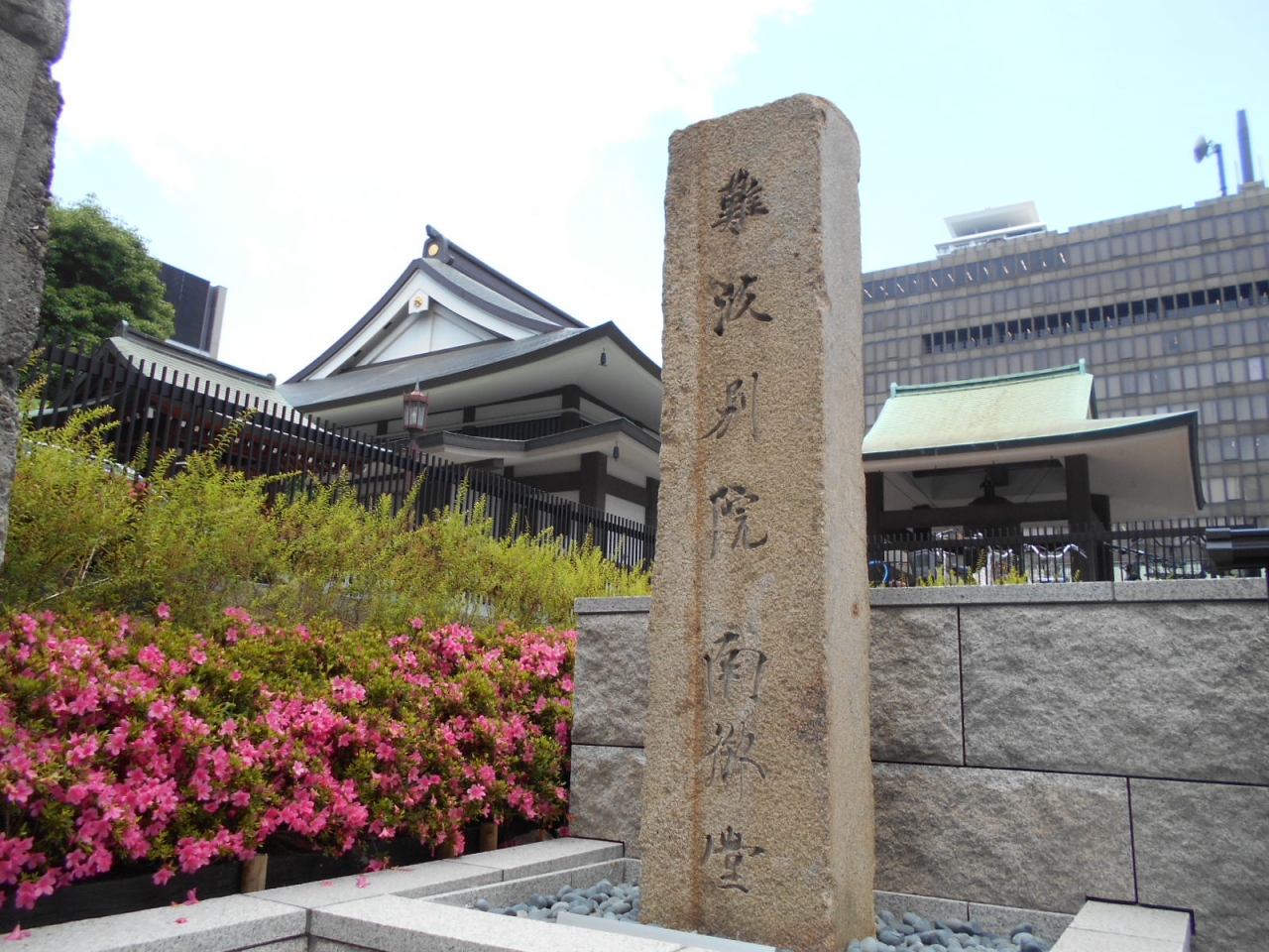 御堂筋沿いにある大きなお寺です。南御堂と呼ばれています。教如上人建立の大谷本願寺が現在地に移り、京都の東本願寺創立とともに難波御坊となりました。江戸時代、大坂町人は御堂が見える場所に家を持つことが誇りだったそうです。本堂は、昭和36年に再建された鎌倉様式です。優美な屋根が印象的です。