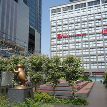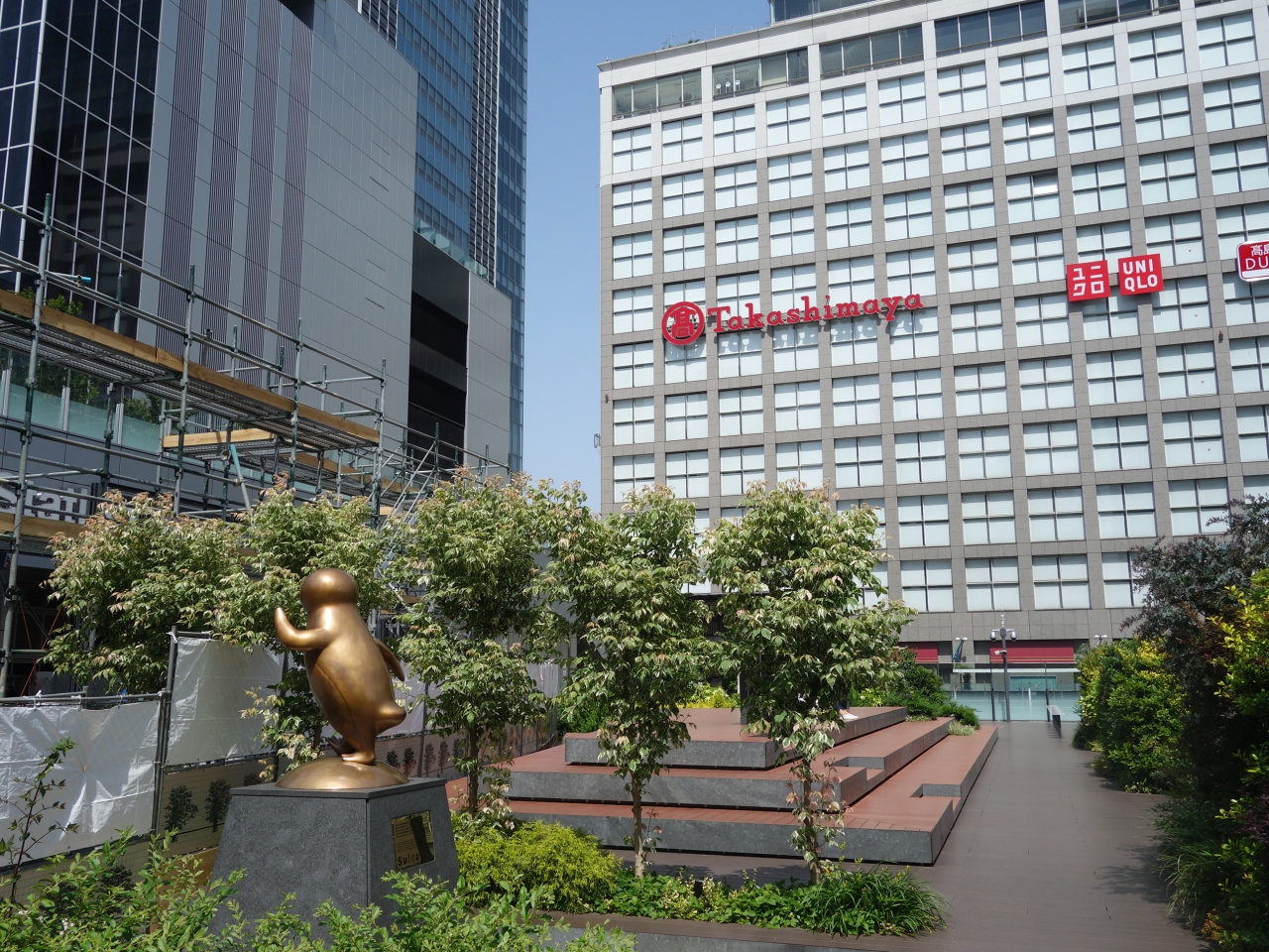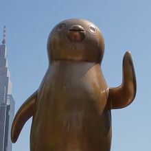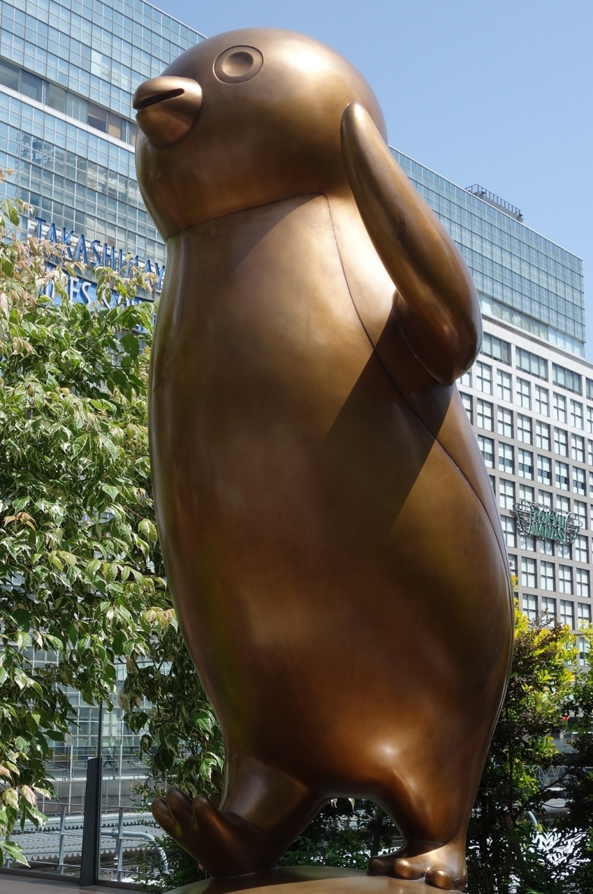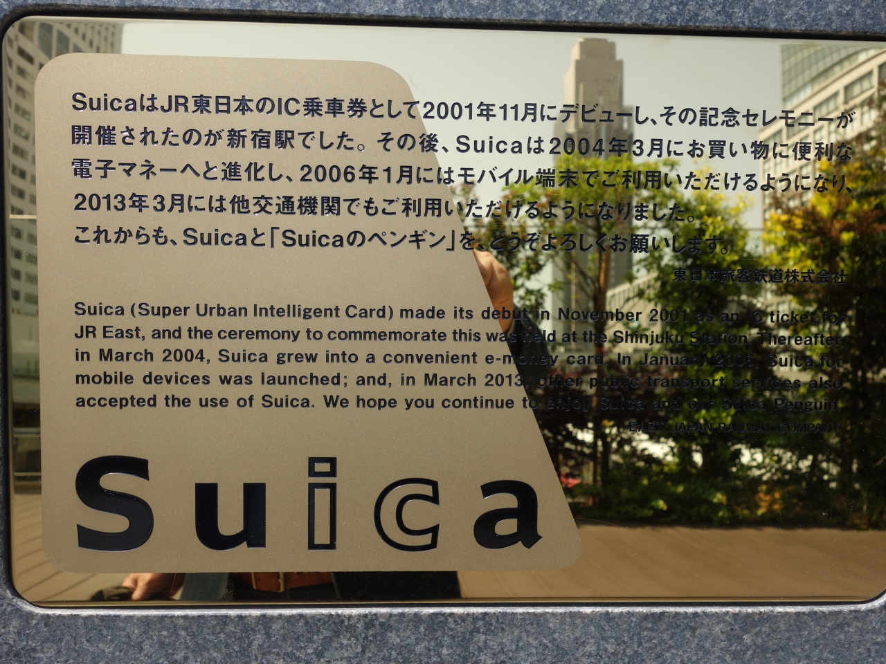 鉄道やバスに乗るときに使うSUICA。その元祖のペンギンがバスタにいます。南側の2階展望台にその銅像が建っているのです。そう,スイカそのものの顔をしています。代々木のドコモのビルをバックに悠然と,そして,雨にも風にもマケズに立っています。