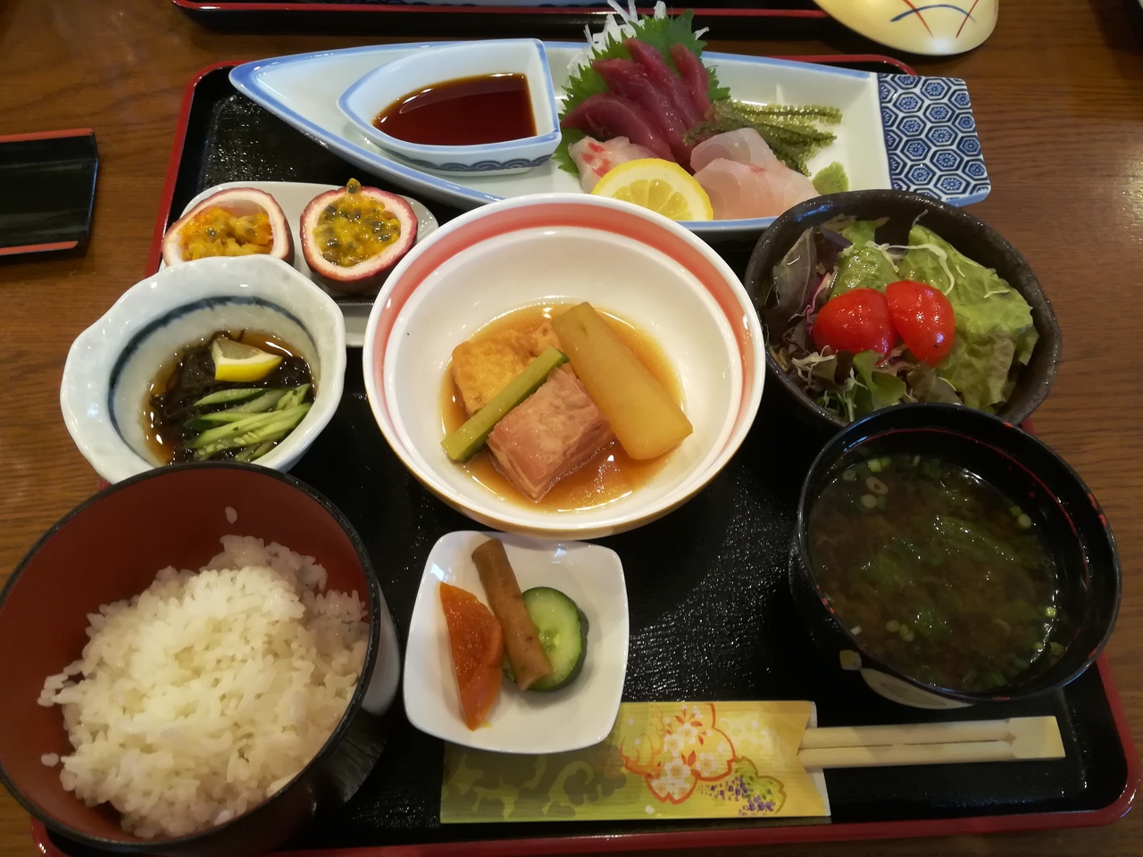 伊勢海老、刺し身、もずく酢、煮物、お新香、ドラゴンフルーツ、サラダどれも新鮮でした。