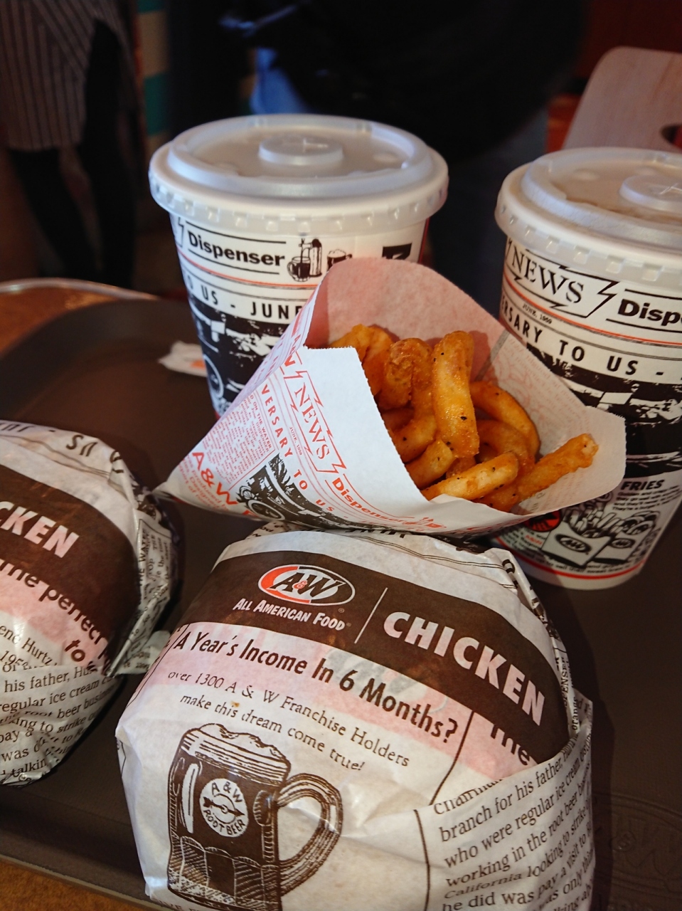 沖縄最後のお食事は《A&W》店内は込み合っていましたが定員さんがとてもテキパキされていてお席の誘導や後片付けをしてくれるので快適な店舗ですよ(*^^*)カーリーフライとってもスパイシーで美味しかったです。