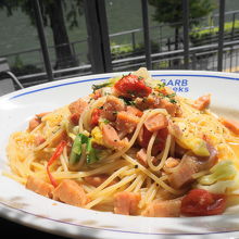 日替わりパスタランチは、ベーコンと春キャベツ・ミニトマトのオイルソース。