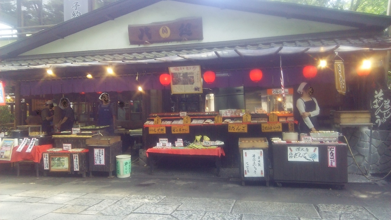 深大寺参道を山門の前で右に折れると3軒目位のお店。他のお店がお団子やそば饅頭が120円のところ、このお店だけ100円なので、ついよってしまう。店の前には、ベンチが幾つもおいてあり、座布団も用意されている。道の脇の水の流れに癒されながら、ぼーっと団子を食べるのもよい。