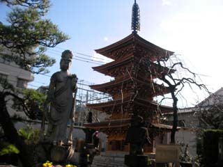 都営三田線の三田駅から台地の西側は寺町になっていて三田五丁目交差点の近くのビルの谷間に新しい建物の慈眼禅寺があり、山門をくぐると、観音像の隣に小さな五重塔があり、小さいながら組み木が精巧に出来ています。