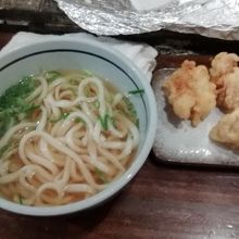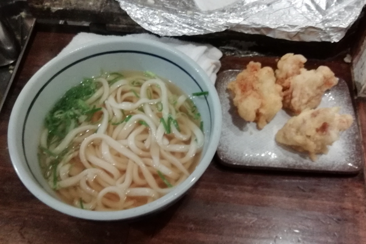 JR五反田駅西口から徒歩1分にある立喰うどんの店です。店の左前に券売機がありますが次から次と、お客さんが来ます。メニューは冷と温それぞれで同じものがあるようです。かけうどん、とり天を別々に購入。店内は狭いですが窮屈感はありません。揚げてのとり天が3