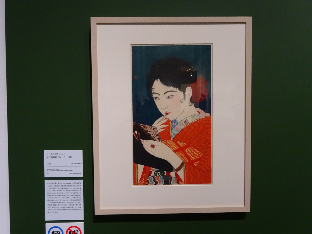 作品は大正から昭和初期の木版画が中心。江戸時代の浮世絵版画を意識しつつ20世紀前半の風俗や風景などが描かれた作品が、「女性」「風景」「役者」などジャンル毎に多数展示されています。元々浮世絵は大衆向けに発展しただけに、今回の展示はいずれも親しみやすい内容でした。