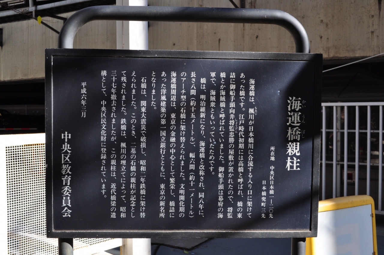日本橋の江戸橋一丁目交差点の近くに石碑があります。かつてこのあたりには日本橋川に流れる楓川という川がありましたが、その合流する付近に海運橋と呼ばれる橋があったそうです。その後建て替えられたりもしながら昭和37年に楓川が埋め立てられるまで橋がかかっていたそうです。現在では橋の親柱と案内板が残されているだけではありますが、この辺りが川であったという面白い事実が知れて良かったです。