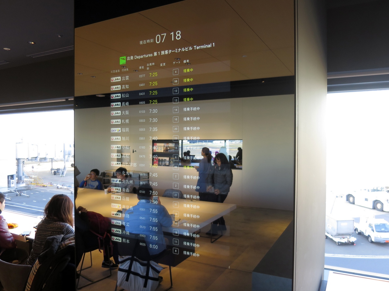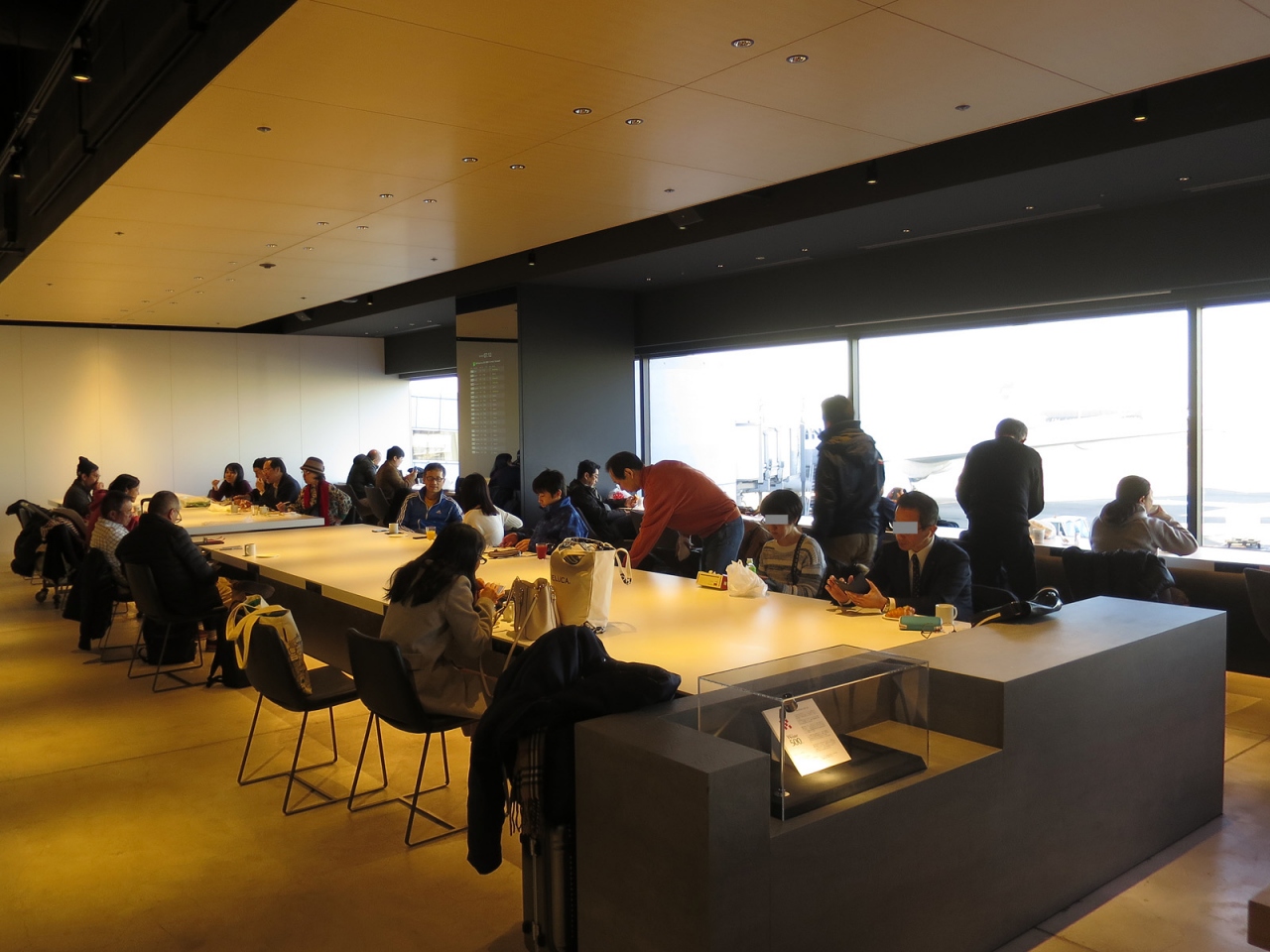 できたばかりの綺麗で広いカードラウンジです。タイミングによっては入口に行列ができていたりしますが、座席は多めですし、国内線用のためお客さんの平均滞在時間も短めだからでしょう、席が埋まっていたことは今までありません。フライトスケジュールは一般的なテレビモニターではなく、柱部分と一体化されておりカッコイイですし、私が利用した大テーブル席には情報コンセントや傘置きも装備されていましたが、他の席も同様に装備されていると思います。また入り口やラウンジ各所に展示してあるWonder500の品々も目の保養になります。飲み物各種、美味しいコーヒー、また早朝便ではクロワッサンが給されていました。従来のカードラウンジとは一線を画する良いラウンジです。