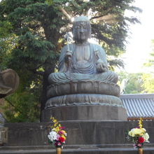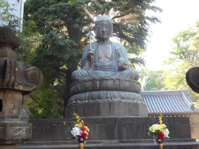 境内に入ってすぐ左手に建つ銅造地蔵菩薩は、深川の地蔵坊正元が江戸時代中期に京都六地蔵に倣って造立した「江戸六地蔵」の第一番に数えられます。現存する六地蔵の中では像高が最も高く275センチに達します。また、唯一笠を被っていない像で、そのせいか風雨に晒されたお顔が歳月を感じさせます・・・。