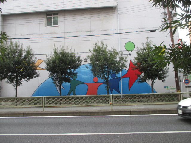 普通の大通りで、特筆すべきことはさほどありませんが、通りにある小学校の壁に少し芸術的な壁絵がありました。あと、通りを少し入った場所に、東京タワーの壁絵のようなオブジェのようなものがあって、これはへーっと思えるものでした。