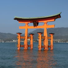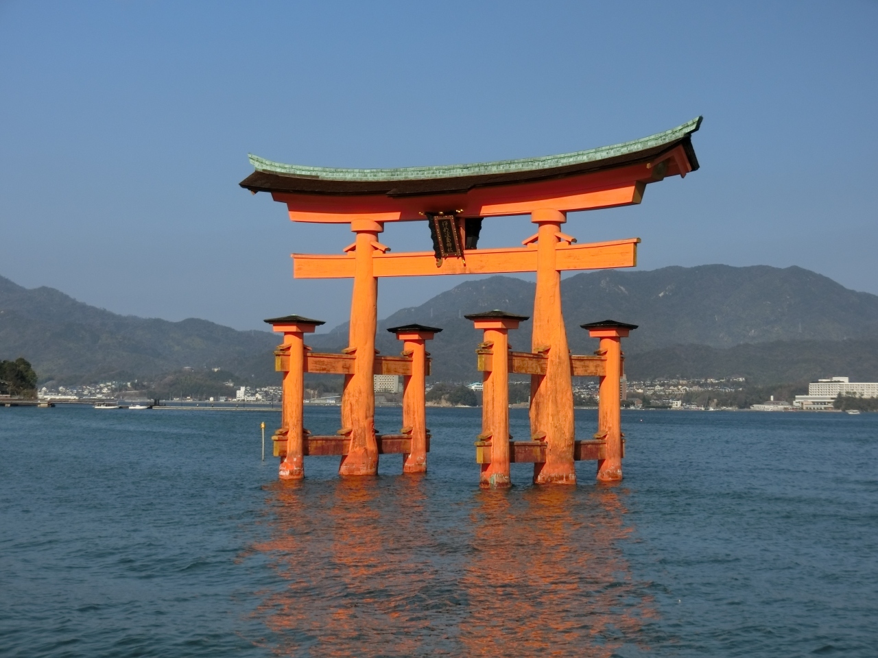 厳島神社といえば大鳥居。遠くから船からでも見える。だんだん近づくにつれ海の中に浮かんでいる姿は神秘さを感じさせる。行ったときは満潮と時で鳥居の側に近づけなかったけれど、帰るときには潮が引きはじめ、近くまで行くことができた。近くで見ると、鳥居のすごさが実感できる。