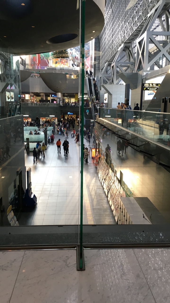 京都駅ビルの空中通路ですが、鉄とガラスでできていて先進的な造りです。京都駅の構造かどうか上の方はあまり人が来ないので、昨今の観光シーズンもここはすいていました。ところどころにある広場は景色もいいので、観光がてらくるのにおすすめします。