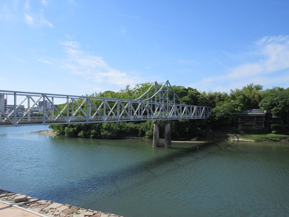 岡山城と岡山後楽園の間を流れる旭川に架かる橋が、1954年に架けられた月見橋です。鉄骨の橋ですが、無骨さを中和する白い塗装が施されていますし、威圧するような大きさではなく歩行者と自転車用に橋であることから、うまく風景に溶け込んでいました。訪れた日が天気が良く、この橋からは緑豊かな岡山城と後楽園の風景を楽しむことが出来ました。